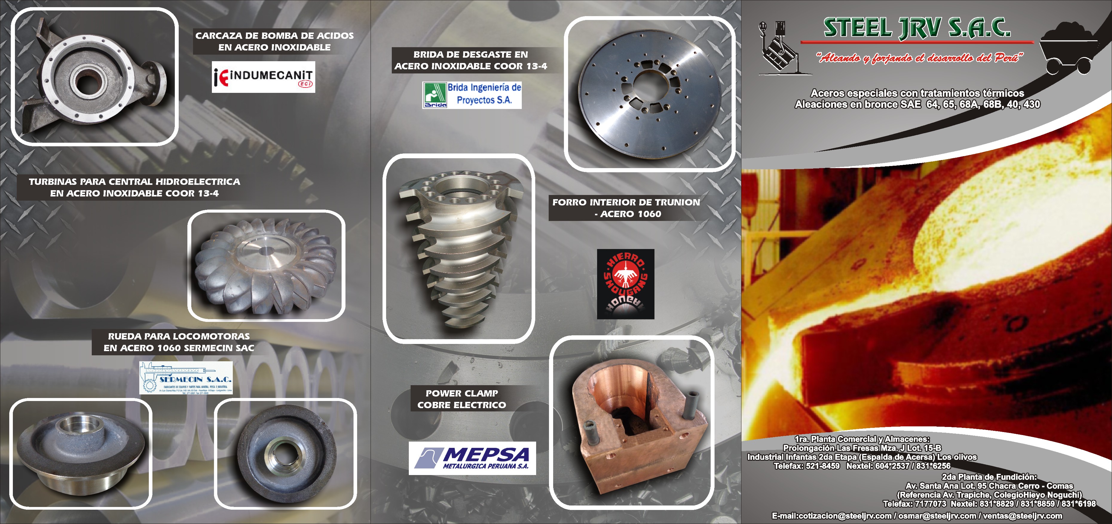 STEEL JRV S.A.C nuestra empresa se dedica a la fundición de metales ferrosos y no ferrosos como: Fierro Fundido, Aceros Especiales, Bronces(SAE 40, 62, 64, 65,68°,68B),cobre Electrolítico y Aluminio con una capacidad de 1,100tn., se les brinda asesoría técnica sobre planos, moldes y la elección del material que solicite, poseemos una infraestructura y equipamiento que de sus productos a entera satisfacción de los mismo. Además, contamos con hornos de tratamiento térmico, con un espectrómetro que nos proporciona un análisis Químico de primerísima calidad y con el personal técnico debidamente capacitado y con la experiencia necesaria en el manejo de modernos hornos a inducción eléctrica.